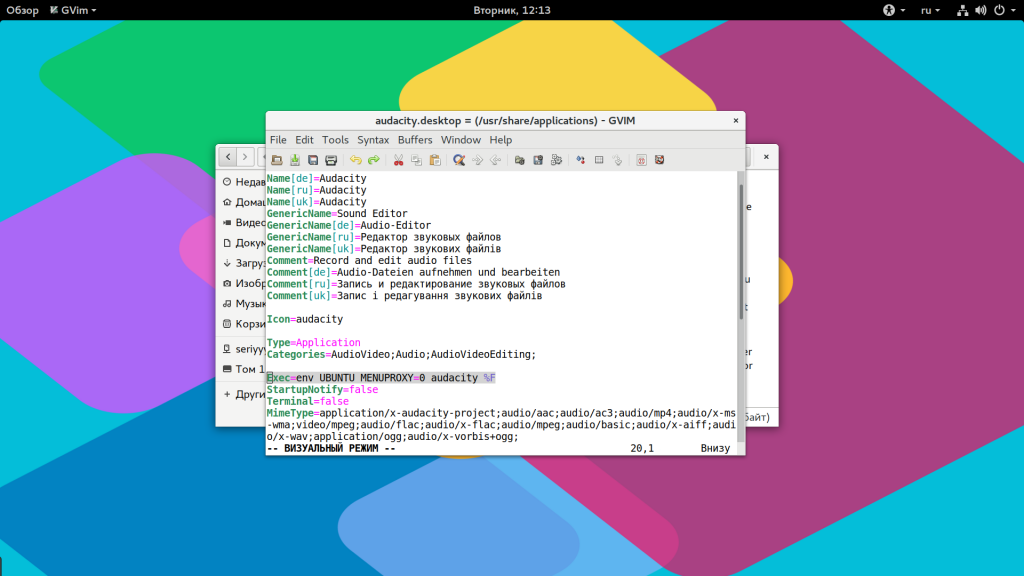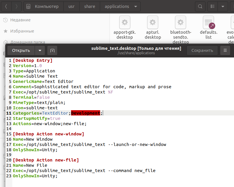 Точно так же работает запуск скриптов в графическом интерфейсе. Вы можете найти все ярлыки из меню в каталоге /usr/share/applications/. Любую программу можно запустить двойным щелчком отсюда. Но давайте посмотрим что находится внутри ярлыка, для этого откройте его в текстовом редакторе: