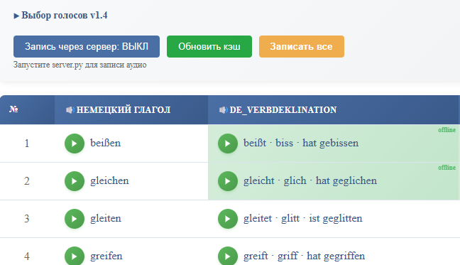 то будут озвучены все ячейки для которых нет аудиофайлов. Если все удалить и нажать кнопку «Записать все», то будет созданы все файлы.