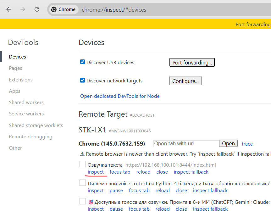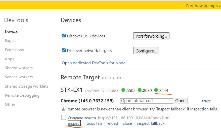 8. Нажать возле адреса страцы которую нужно дебажить (например: https://192.168.100.101:8444) inspect, будет открыто новое окно с страницей телефона и все что будет делаться на ПК будет изменяться и в телефоне.
