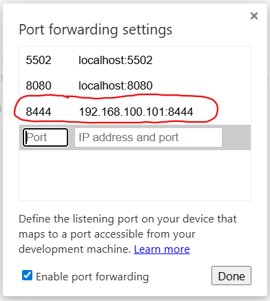 Поставьте галочку Enable port forwarding и нажмите Done.